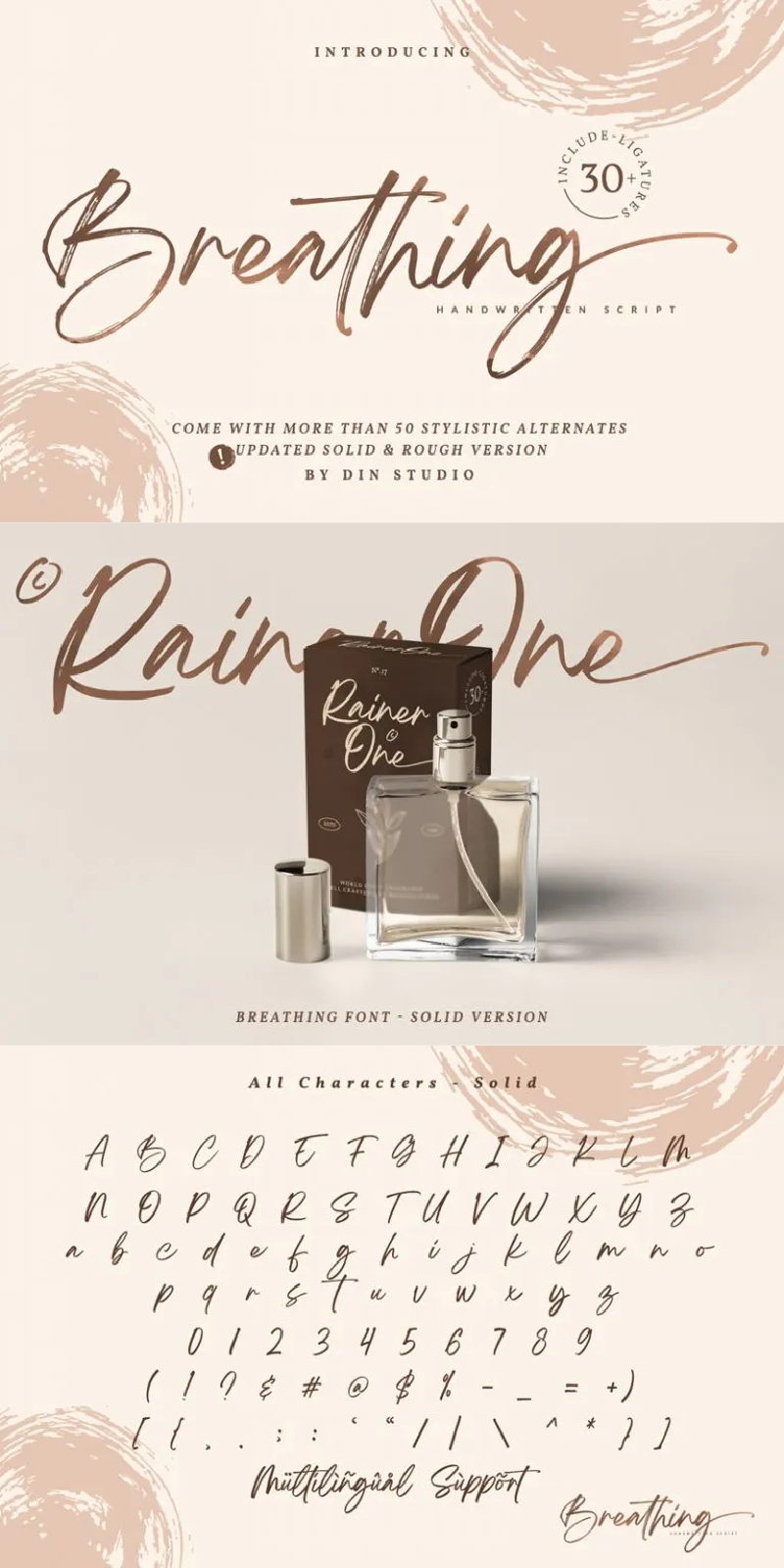 Breathing, a beautiful brush signature font, is made for any professional project branding, such as signature logos, watermarks, wedding invitations, branding, promotions, product packaging, etc. Every letter has a unique and beautiful touch. This font comes in a rough and solid version.