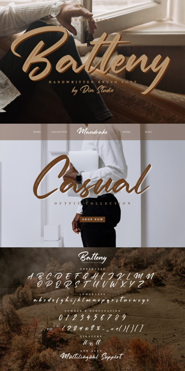 Batteny is a classy script font mixed with brush textured handwriting that will make your design projects more powerful. It is made for any professional project brandings which is best for logos, brandings, and quotes. Every letter has a unique and beautiful touch. See the previews above to get some inspiration on how you can use them. Happy designing!