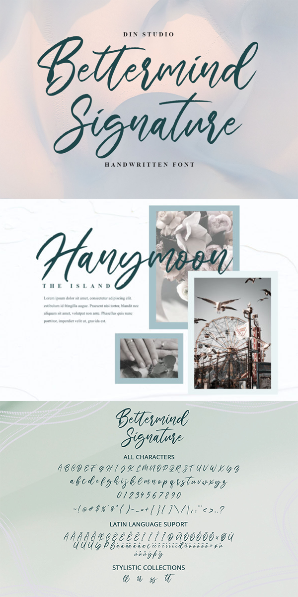 Bettermind Signature is a handwritten font. With a classy and beautiful handwritten style, it brings a classy and chic typeface. Made for any professional projects. Bettermind signature is best used for weddings invitation, ads, branding, logotype, and quotes. The font includes full set of hand lettered uppercase and lowercase letters, numerals, punctuation, and ligatures. See the previews above to get some inspiration on how you can use them. Happy Designing!