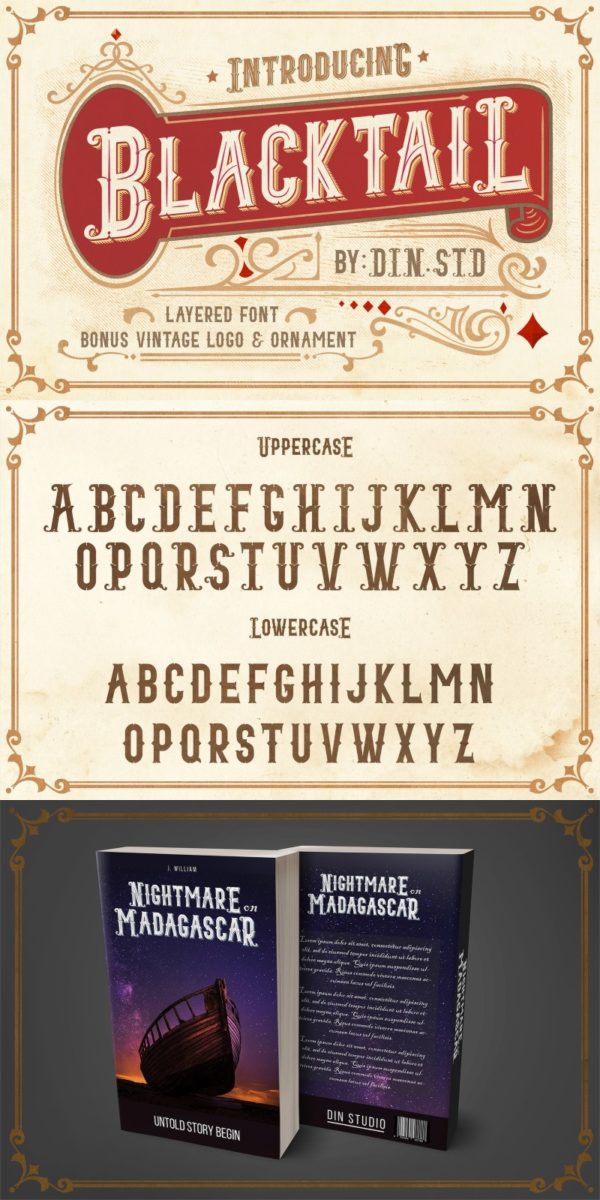 Calling out all Blacktail! Here is Blacktail Vintage Font for your vintage concept project designs. This font presents a vintage and layered style containing four layers. It is best for branding projects, t-shirt printings, book covers, film titles and any other designs needing vintage vibes on them. Make your design look powerful with this font.