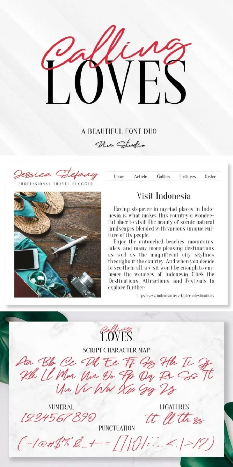 Calling Loves is a beautiful font duo, designed with modern style. The combination of script and modern serif will make your design more beautiful. It’s suitable for branding, web design, personal signature (logo) and many other modern designs.