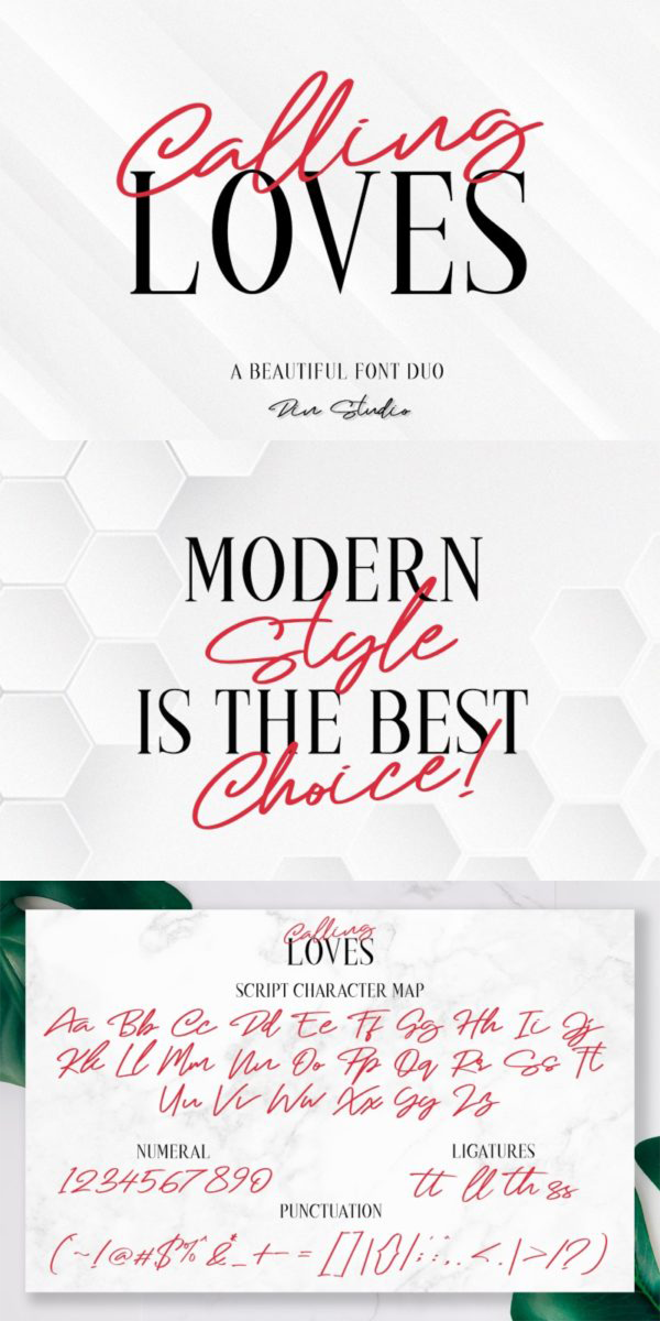 Hello, Guys! Say hello to Calling Loves! Calling Loves is a beautiful font duo, designed with modern style. The combination of script and modern serif will make your design more beautiful. It’s suitable for branding, web design, personal signature (logo) and many other modern designs. See the previews above to get some inspiration on how you can use them. Happy Designing!