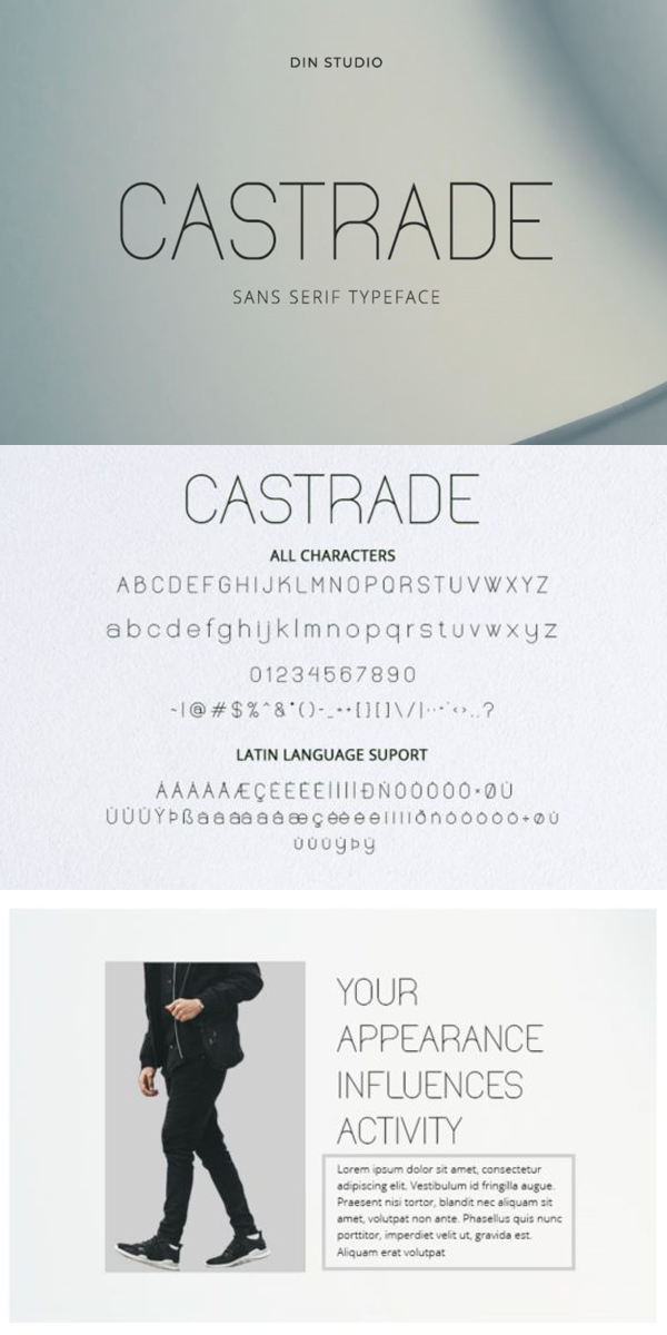 Castrade is a modern display sans font made for any professional project brandings. Every letter has a unique and beautiful touch. It is suitable for social media campaigns, ads, brandings, merchandise, logotypes, cards, and more! See the previews above to get some inspiration on how you can use them. Enjoy the font!