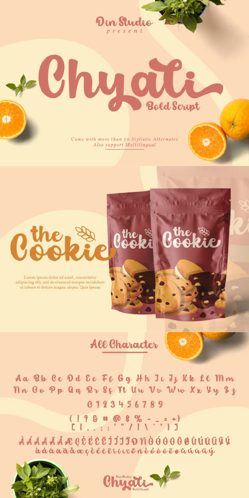 Chyali is a bold script font for food packaging. It can elevate your project designs. Chyali font includes a full set of handwritten uppercase and lowercase letters.