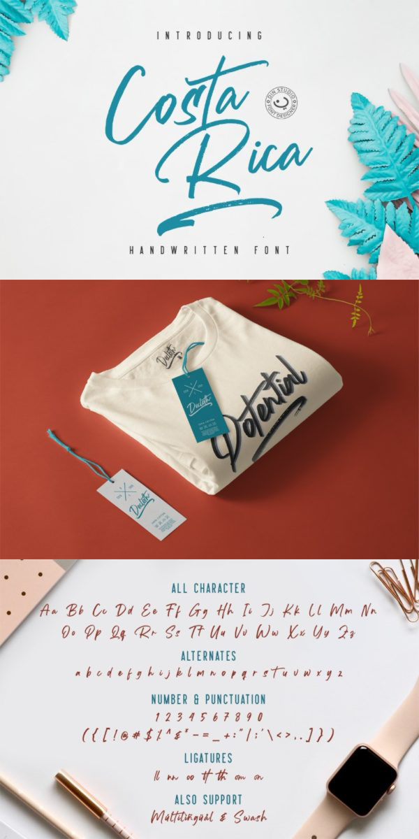 Hello, everyone! Introducing Costa Rica – Handwritten Font. Costa Rica is a brush font made with natural brush. The texture from the brush font will make your designs more beautiful and powerful. This font is suitable for any designs like brandings, quotes, t-shirt printings, etc.