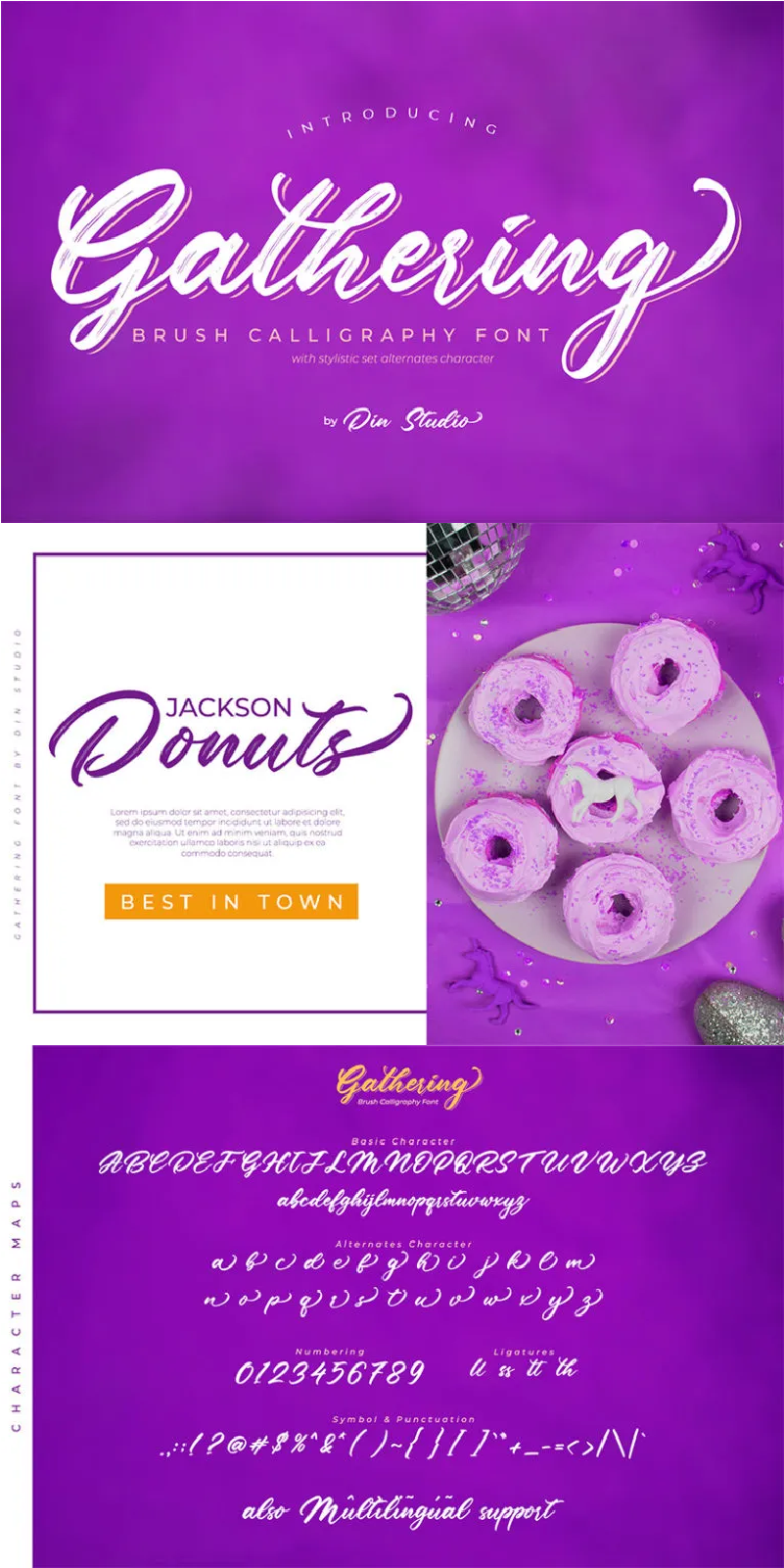 Gathering is a brush calligraphy font. Combined with brush textured calligraphy will make your design project more powerful. Made for any professional project branding. It is the best for logos, branding and quotes. Every letter has a unique and beautiful touch.