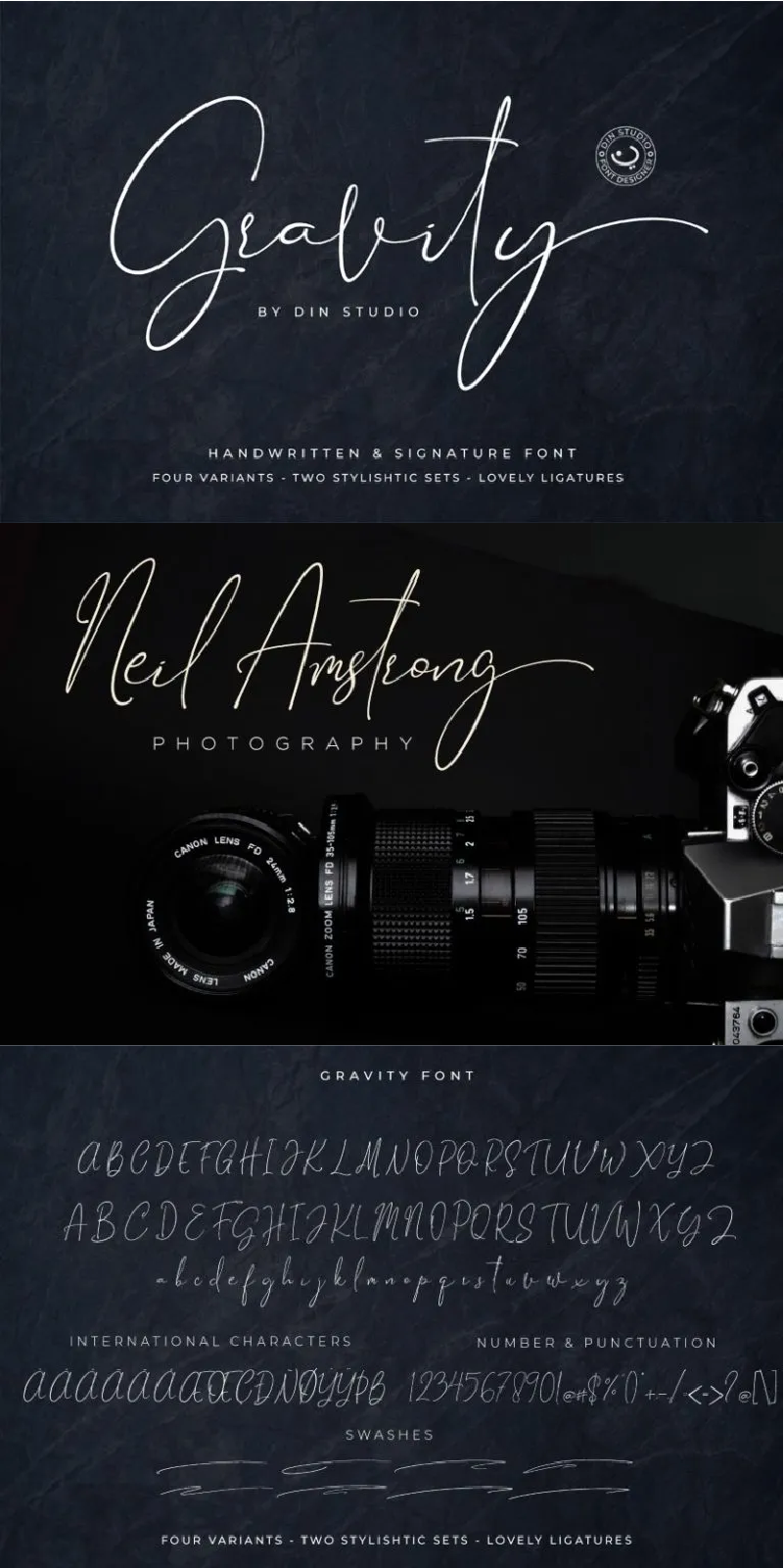 Gravity Font, a luxury handwritten and signature style. This signature font is one of the best-selling products of Din Studio. With four variants of styles, you can create more signatures and handwriting fonts than you need. Gravity will be great for creating the perfect and unique designs for your branding projects, signatures, quotes, weddings, etc.