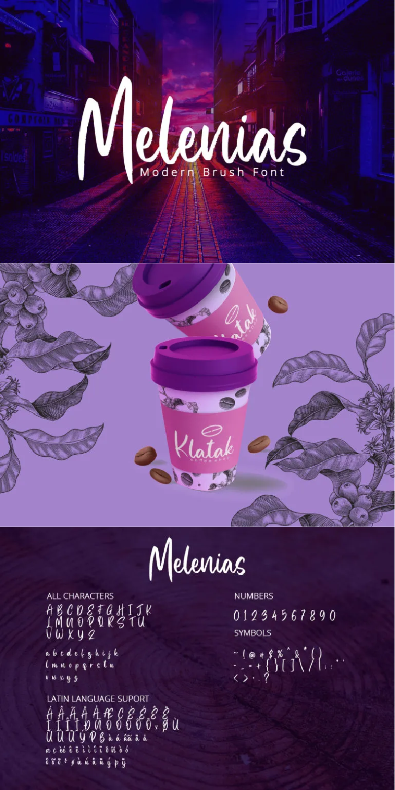 Melenias is a casual brush font. Made for any professional project branding such as social media campaign, ads, wedding invitation, merchandise, and more. Every letter has a unique and beautiful touch.