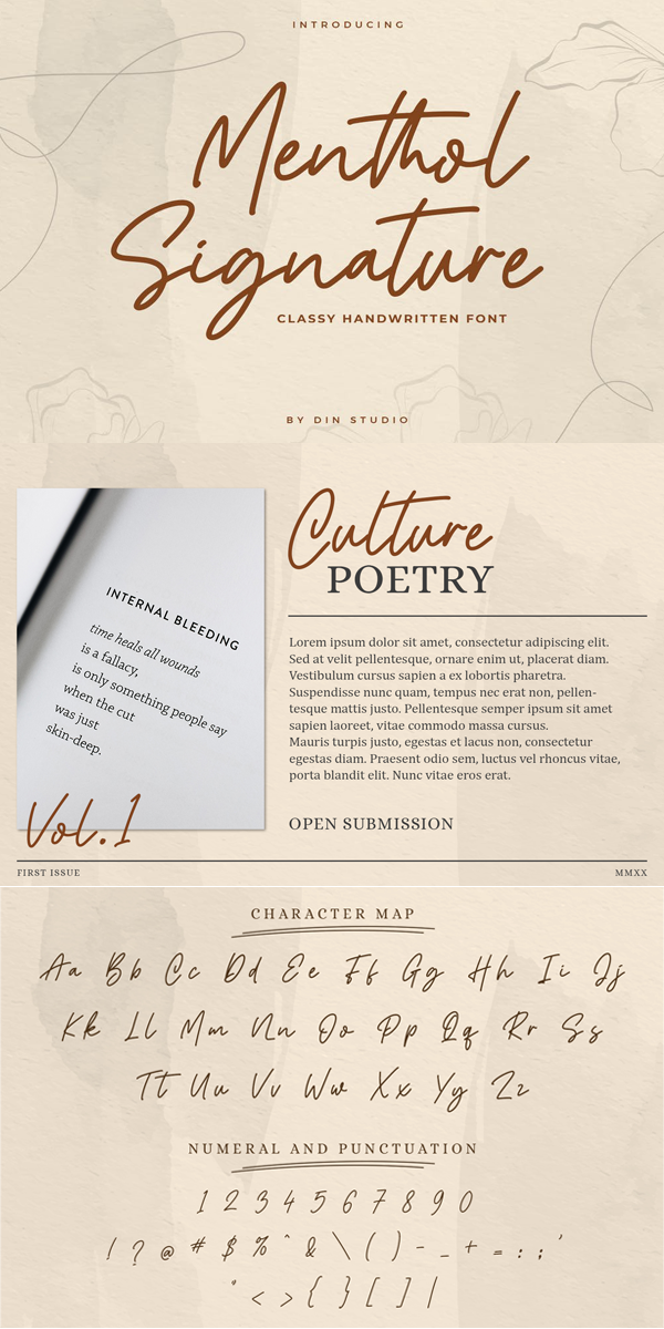 Menthol Signature is a classy monoline font made for any professional project brandings. Every letter has a unique and beautiful touch. The font includes a full set of hand lettered uppercase and lowercase letters, numerals, punctuations, and ligatures. Menthol Signature gives realistic hand lettered style. See the previews above to get some inspiration on how you can use them. Enjoy the font!