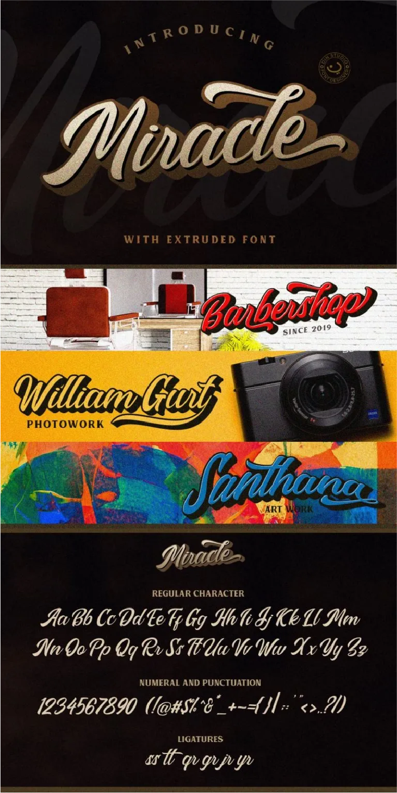 Miracle Script is a modern logotype. It’s suitable for T-Shirt printing, name card design, branding projects, product packaging, quotes, logos, book covers and many other lovely projects of yours. Miracle Script is featured with extruded font so it will make your design look powerful.