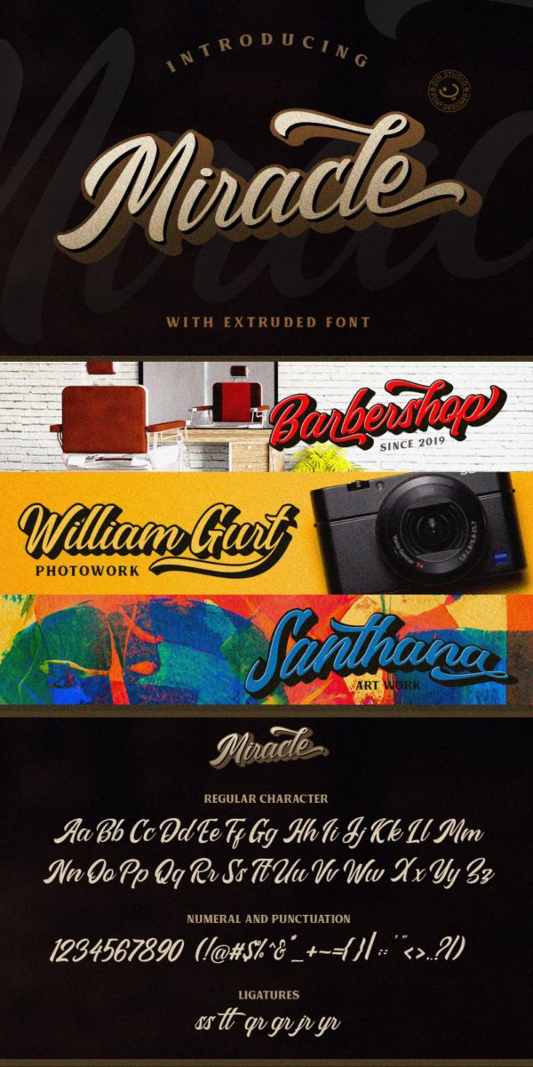 Miracle Script is a modern logotype. It’s suitable for T-Shirt printing, name card design, branding projects, product packaging, quotes, logos, book covers and many other lovely projects of yours. Miracle Script is featured with extruded font so it will make your design look powerful. See the previews above to get some inspiration on how you can use them. Happy Designing!