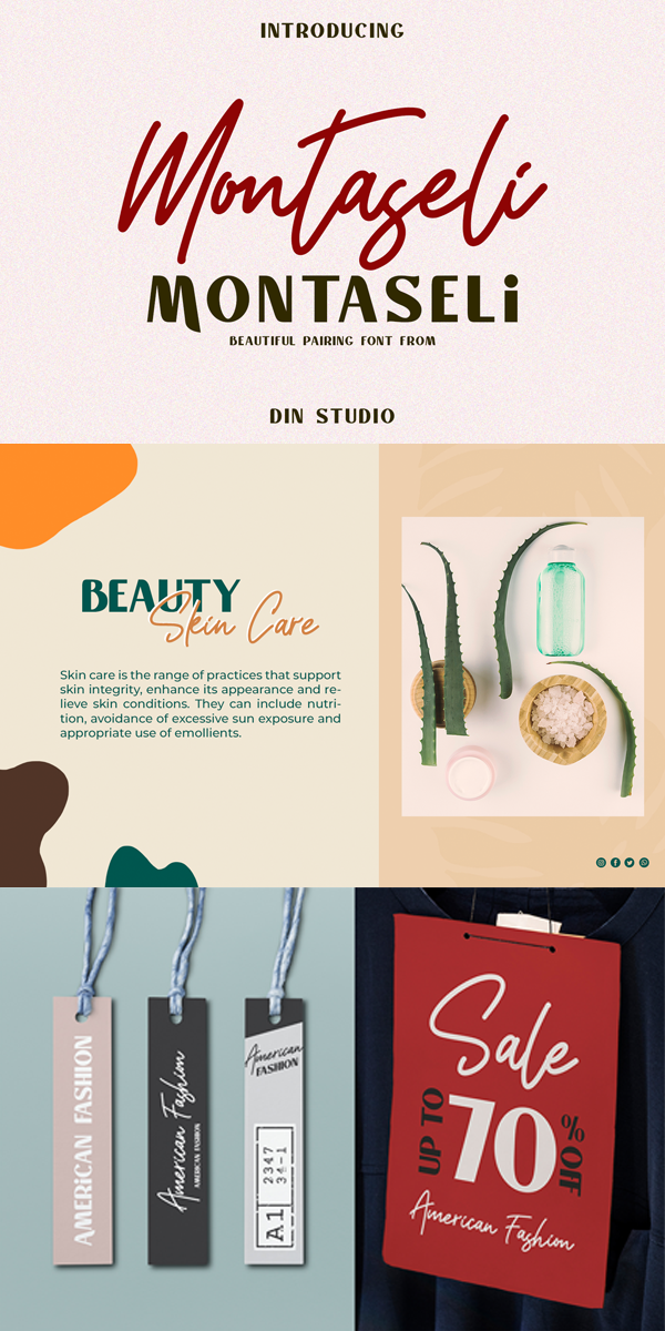 Montaseli – Font Duo. It is a beautiful pairing font from Din Studio designed with a modern and bold style. The font is suitable for brandings, logos, social media campaigns, ads, book covers, cards, invitations, quotes, and more. With the combination of elegant and casual style, this font contains a full set of lowercase and uppercase letters, numerals, punctuations, and ligatures.