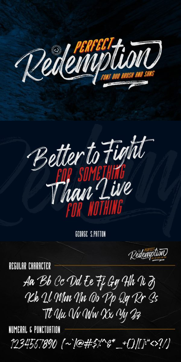 Introducing Perfect Redemption – Font Duo. It is a combination of brush and sans fonts. It is made with a natural brush. The texture from the brush font will make your designs more beautiful and powerful. This font is suitable for any design like brandings, quotes, t-shirt printings, etc. See the previews above to get some inspiration on how you can use them. Enjoy the font!