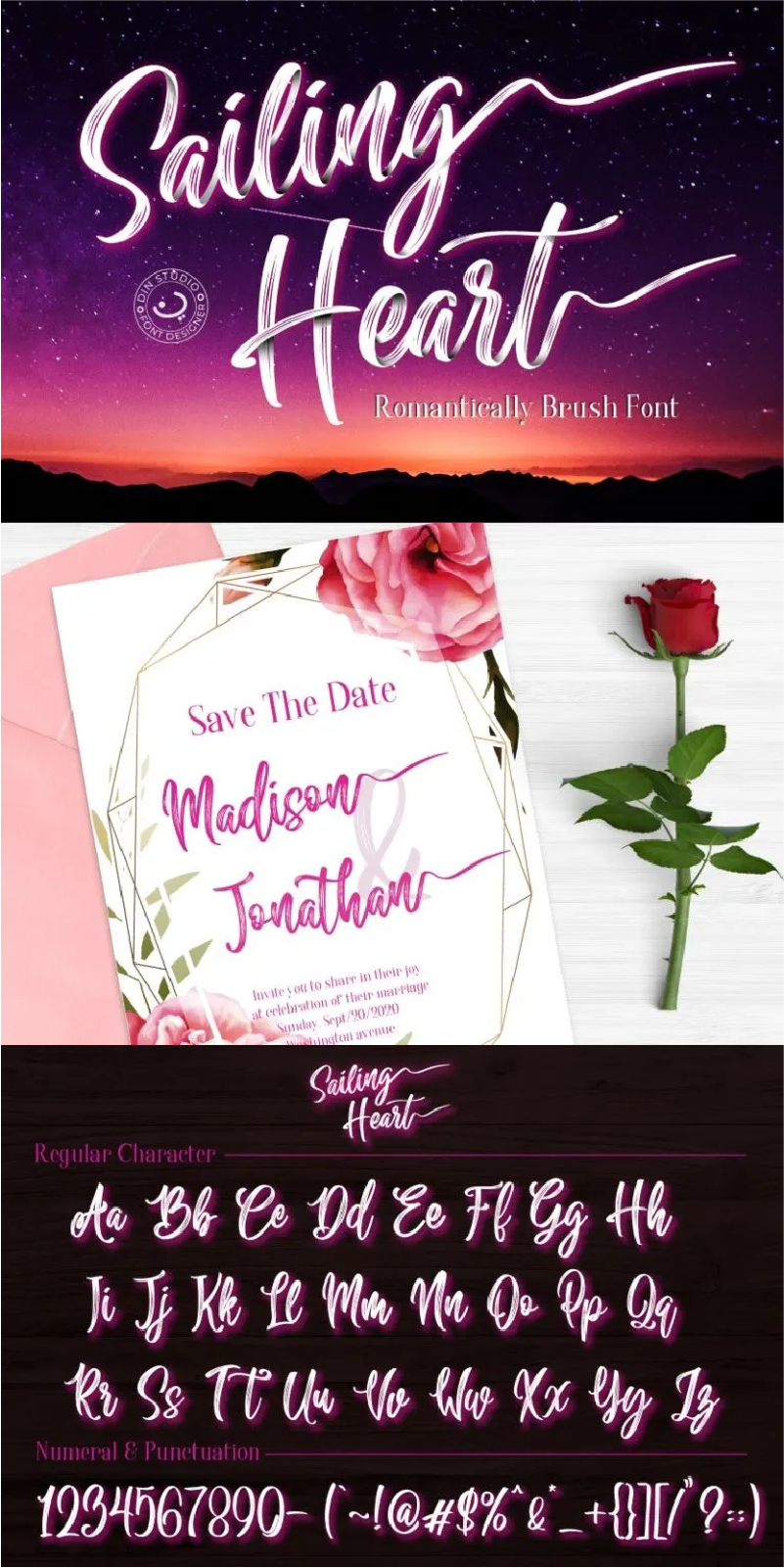 Sailing Heart is a beautiful script font made with natural brush. The texture from the brush font will make your design more beautiful and powerful. This font is suitable for any designs, like brandings, quotes, wedding invitations, lettering projects, etc.
