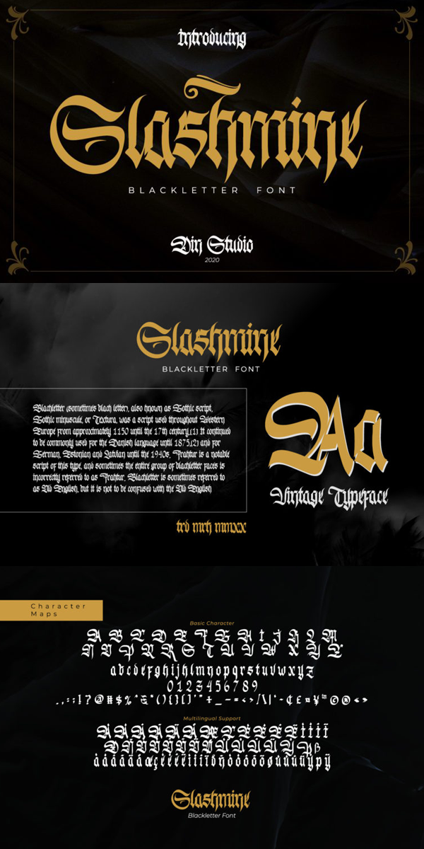 Slashmine is authentic and modern blackletter font. The font is suitable for any branding project like logo, merchandising, t-shirt printing and many more. Outstanding in a wide range of contexts. See the previews above to get some inspiration on how you can use them. Happy Designing!