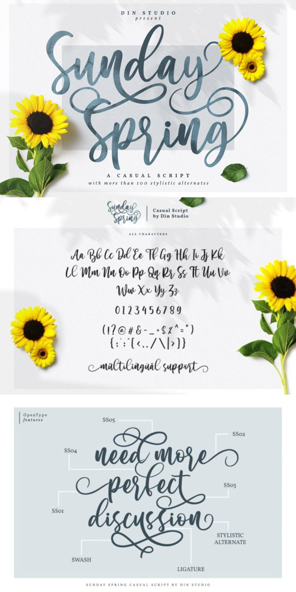 Sunday Spring script font will make your design projects more beautiful. The font is suitable for any designs, for example brandings, fashions, printed templates, quotes, weddings, etc. See the previews above to get some inspiration on how you can use them. Happy designing!