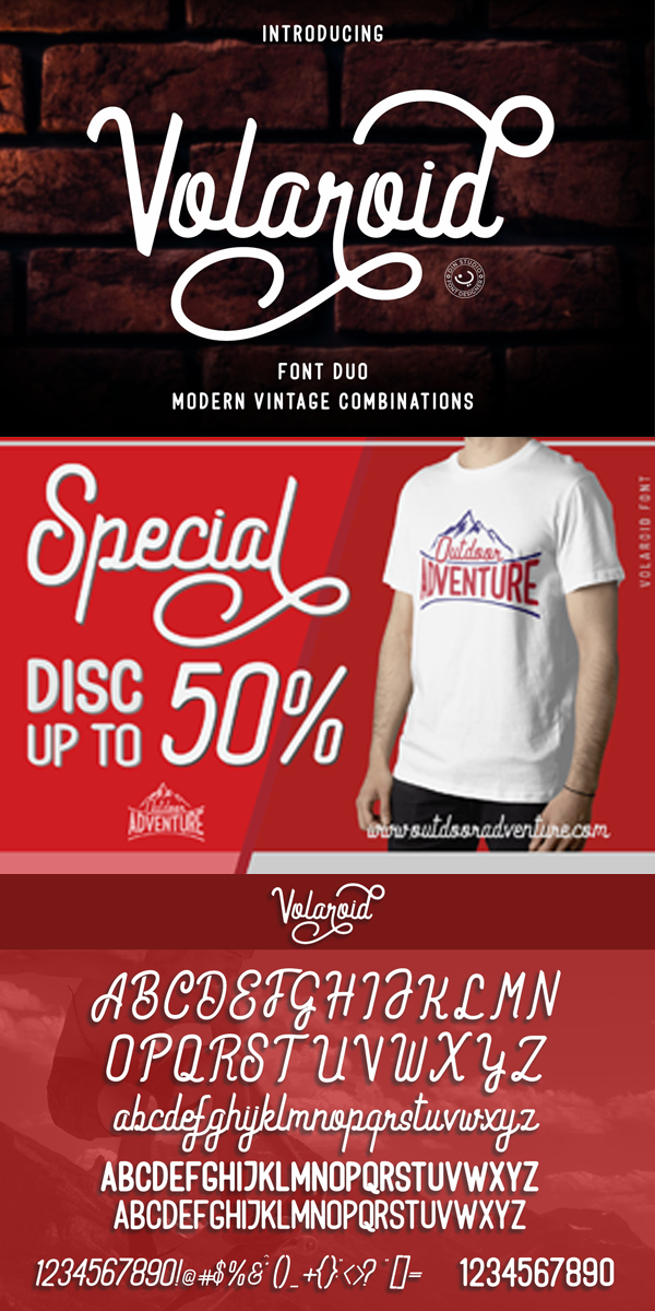 Introducing Volaroid Font Duo, a simple font with modern and vintage style combination. This will bring a modern and vintage atmosphere together. It is a minimalist design for your best project. Volaroid font is best used for logotypes, brandings, and t-shirt printings. See the previews above to get some inspiration on how you can use them. Happy designing!