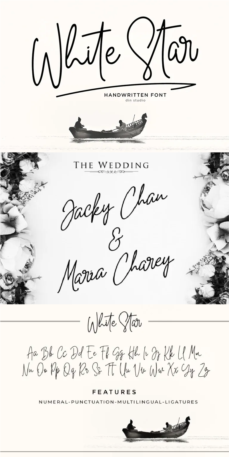 White Star for your incredible project designs. A lovely and chic typeface complements the sophisticated and natural handwritten style. White Star is ideally suited for logos, branding, weddings, and quotations.
