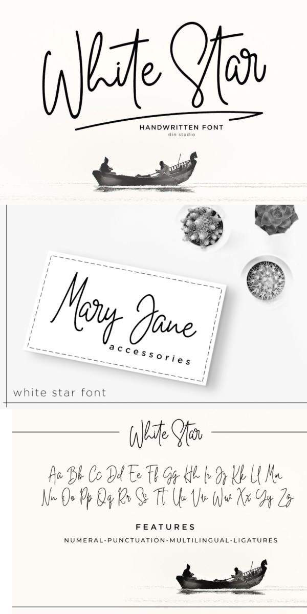 Introducing White Star for your amazing project designs. With a chic and natural handwritten style, it brings a beautiful and chic typeface. White Star is best used for logotypes, brandings, weddings, and quotes. See the previews above to get some inspiration on how you can use them. Happy designing!