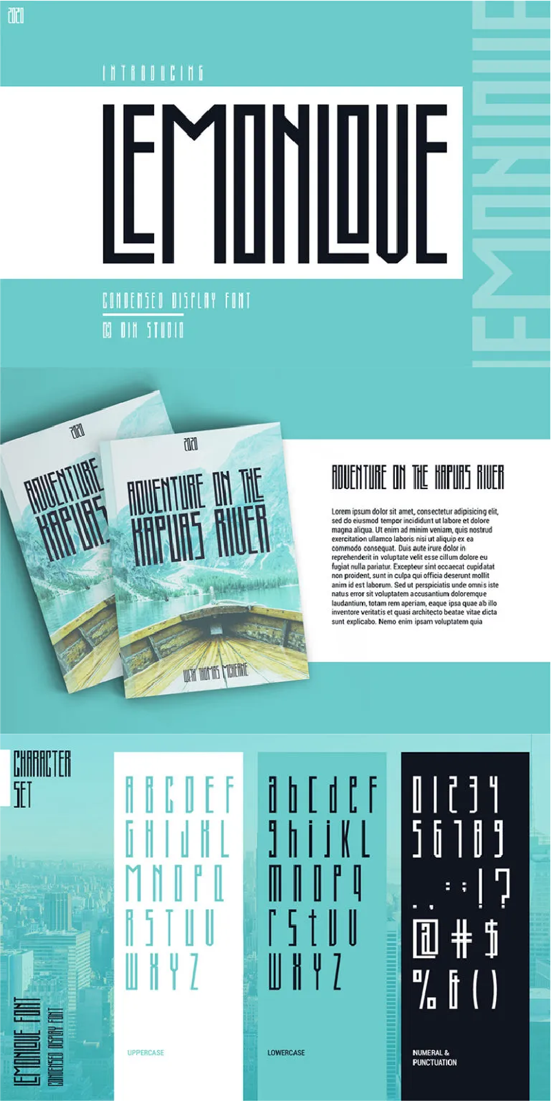 Lemonlove, a condensed display font coming with modern themes. It can be applied to some designs such as logotypes, brands, packaging, quotes, t-shirts, book covers, and other custom designs.