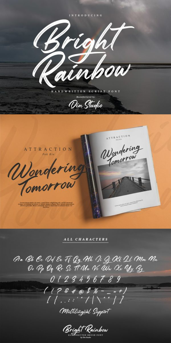 Bright Rainbow – Classy Brush Font. The brush combined with handwritten font will make your design project more beautiful. Made for any professional project branding. It is the best for logos, branding and quotes. Every letter has a unique and beautiful touch. See the previews above to get some inspiration on how you can use them. Enjoy the font!