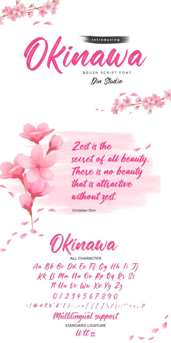 Okinawa – Classy Script Font. This brush font will make your design project more powerful. Made for any professional project branding. It is the best for logos, branding and quotes. Every letter has a unique and beautiful touch. See the previews above to get some inspiration on how you can use them. Enjoy the font!