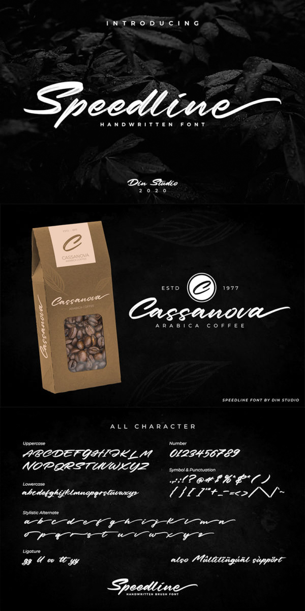 Speedline – A Classy Brush Font. The brush combined with handwritten font will make your design project more beautiful. Made for any professional project branding. It is the best for logos, branding and quotes. Every letter has a unique and beautiful touch. See the previews above to get some inspiration on how you can use them. Happy Designing!