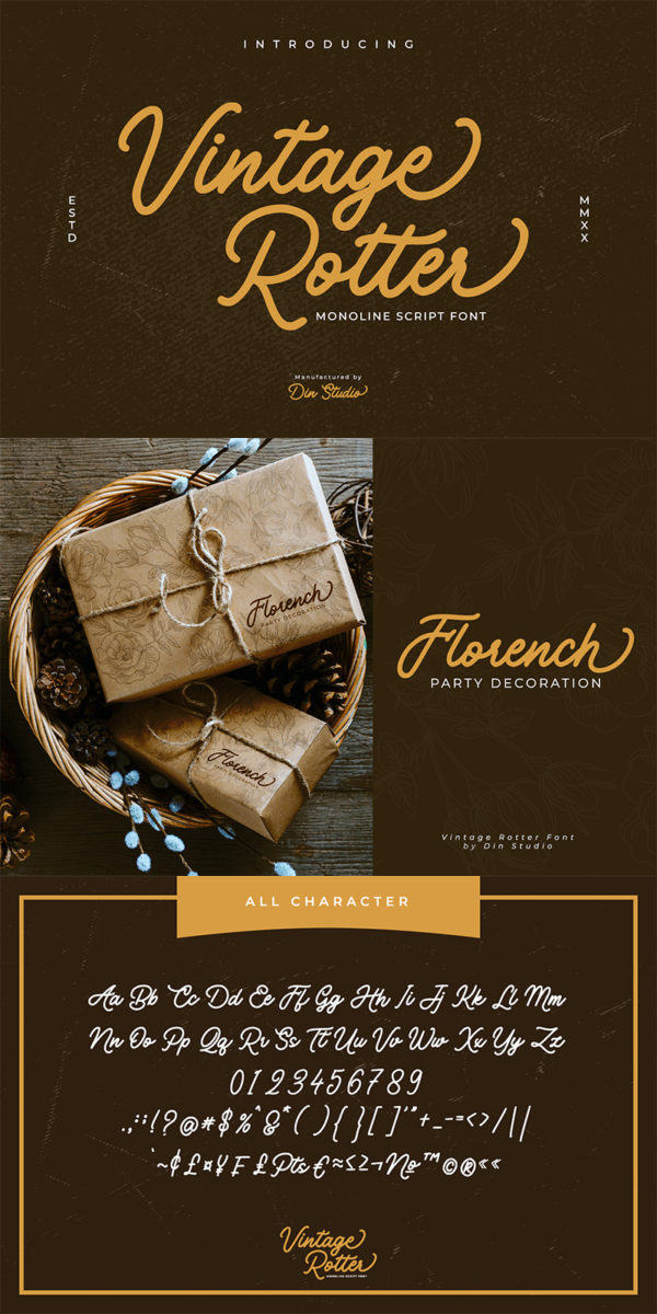 Vintage Rotter – Monoline Script Font made for any professional project brandings best used for brandings, printings, weddings and quotes. Every letter has a unique and beautiful touch. See the previews above to get some inspiration on how you can use them. Happy designing!