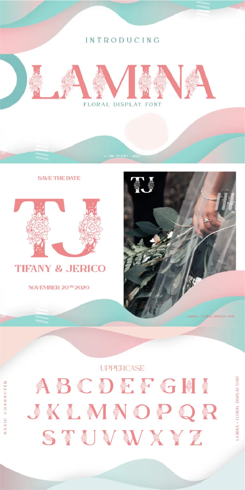 Lamina is a beautiful decorative font featuring elegant flowers. Get inspired by its authentic feeling and use it to create gorgeous wedding invitations, lovely stationery art, eye-catching social media posts, and cute greeting cards.