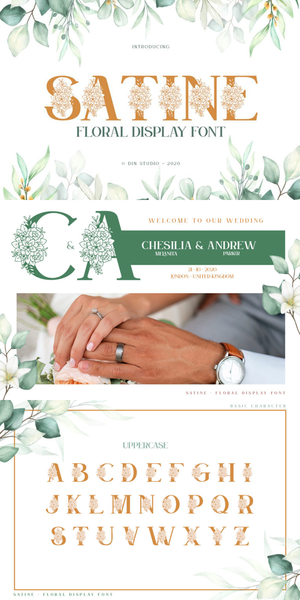 Satine is a beautifully decorated font featuring elegant flowers. Get inspired by its authentic feel and use it to create gorgeous wedding invitations, lovely stationery art, eye-catching social media posts, and cute greeting cards. See the previews above to get some inspiration on how you can use them. Happy designing!