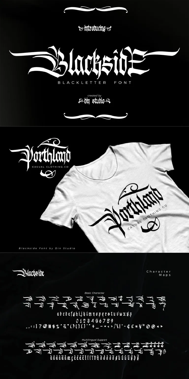 Blackside, a bold and authentic blackletter font suitable for any branding projects, like logos, t-shirt printings, etc. which is outstanding in a wide range of contexts. See the previews above to get some inspiration on how you can use them.