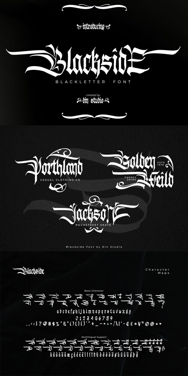 Blackside, a bold and authentic blackletter font suitable for any branding projects, like logos, t-shirt printings, etc. which is outstanding in a wide range of contexts. See the previews above to get some inspiration on how you can use them. Happy designing!