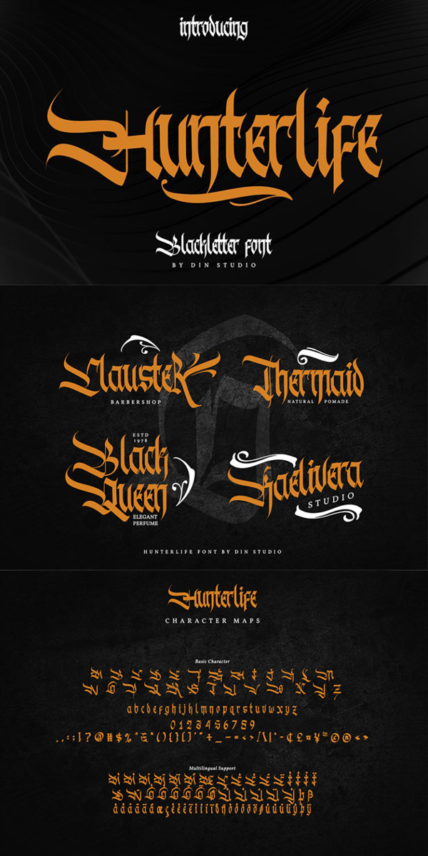 Hunterlife is authentic and modern blackletter font. The font is suitable for any branding project like logo, t-shirt printing and many more. Outstanding in a wide range of contexts. See the previews above to get some inspiration on how you can use them. Happy Designing!