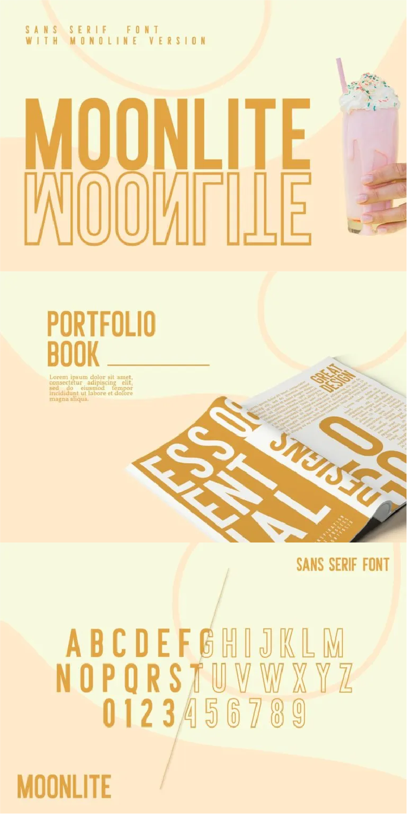 Moonlite is a modern display sans serif font for any professional project brandings, such as social media campaigns, ads, cards, merchandise, and so on. Every letter has a unique and beautiful touch. It is also available with an outline version.