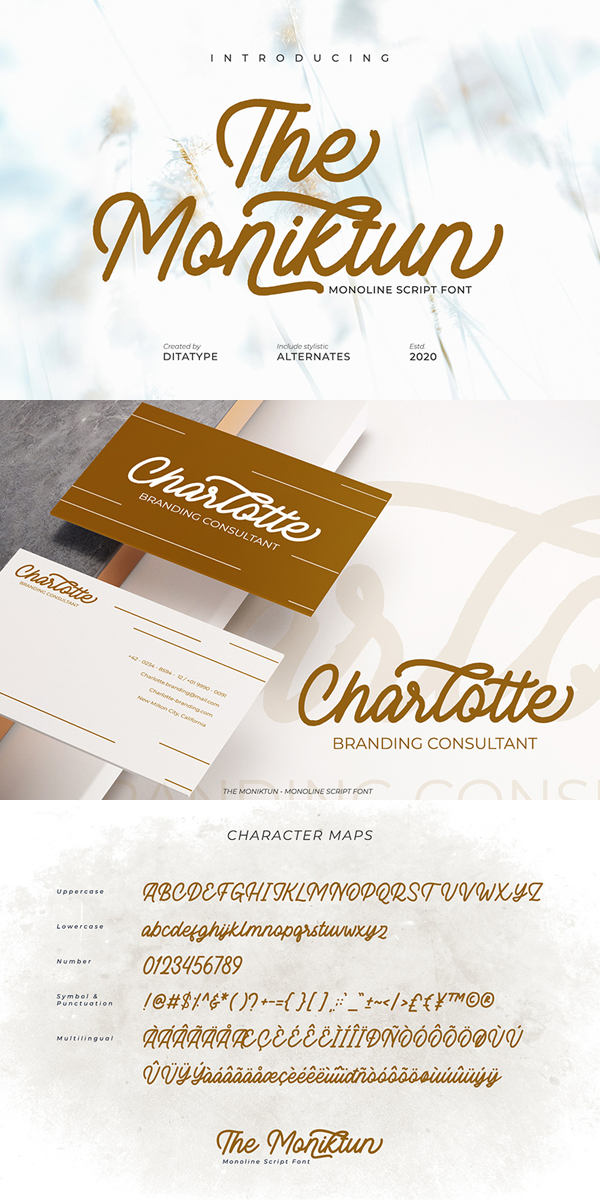 The Moniktun is a monoline script font. Made for any professional project branding that need a modern and attractive typeface. It is the best for logos, branding and quotes. Every letter has a unique and beautiful touch.