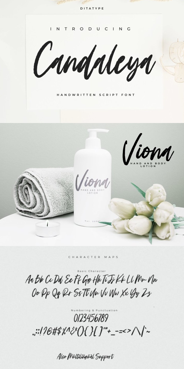 Candaleya is a modern handwritten font. With a classy and natural handwritten style, it brings a classy and chic typeface. Candaleya is best used for weddings, branding, logotype, and quotes.