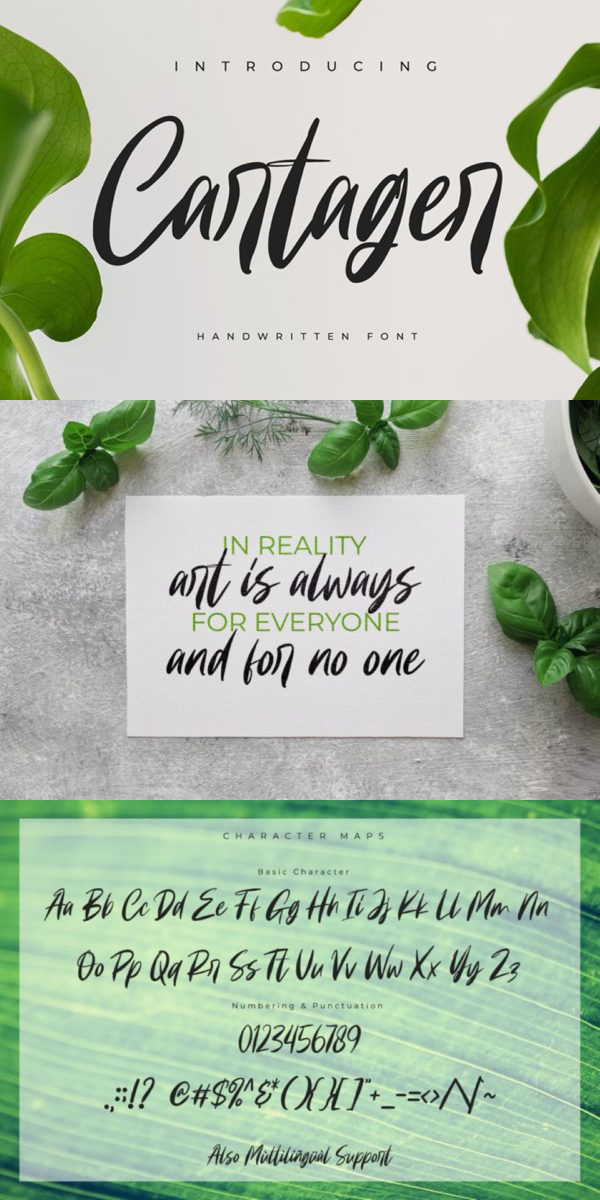 Cartager is a modern handwritten font. With a classy and natural handwritten style, it brings a classy and chic typeface. Cartager is best used for weddings, branding, logotype, and quotes.