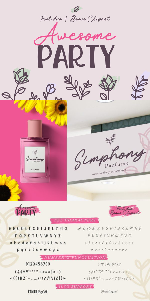 Introducing Awesome Party Font Duo with Doodles. Awesome Party is a beautiful monoline font and combine with a beautiful display font . This font is suitable for any design like branding, quotes, t-shirt printing and etc.