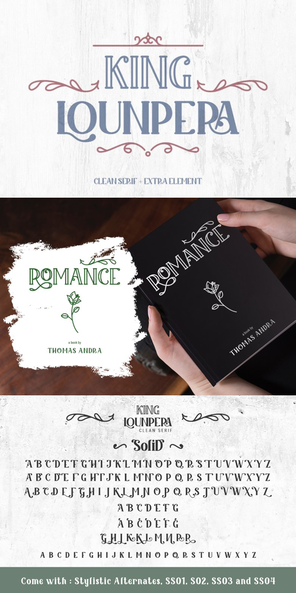 King Lounpera is a beautiful Display font. The family consist from 2 font Solid and Outline. This font is suitable for any design like branding, quotes, t-shirt printing and etc.