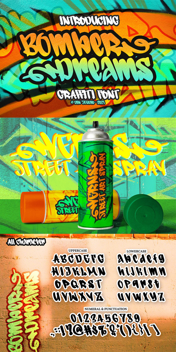 Use this cool and modern graffiti font to breathe a street life vibe into your projects. Bomber Dreams is perfect for logos, printed quotes, cards, packaging, website or social media branding, and many more!