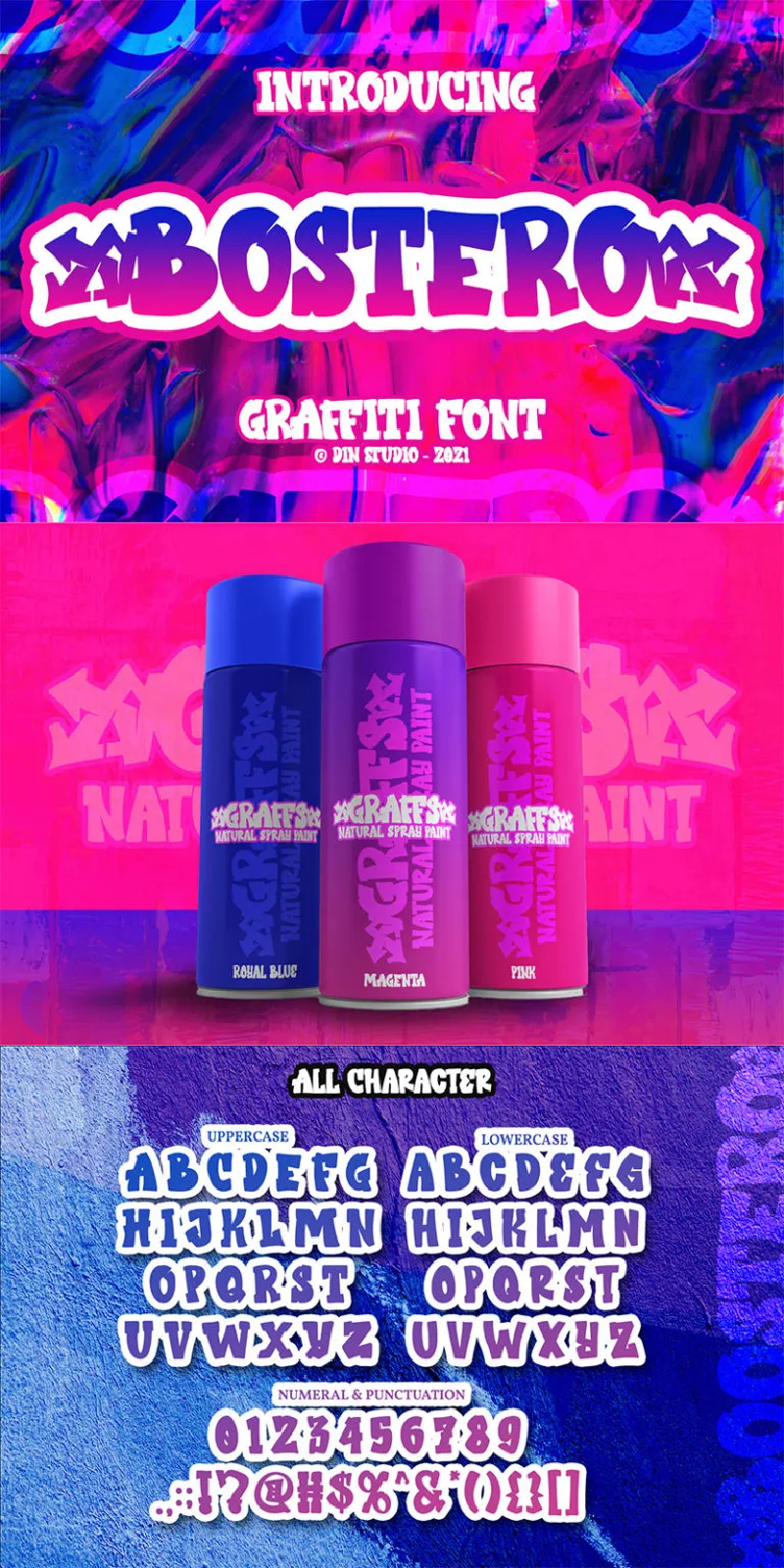 Bostero is a graffiti font style that embodies the urban tagging scene. This stylish font features thick, angular letters, and offers uppercase letters only. With its strong outlines and fat strokes, this is the font you need when you want to create a classic bubble graffiti font look. This font can use for a host of different content needs and projects. Create gorgeous printed quotes, standout packaging, and beautiful