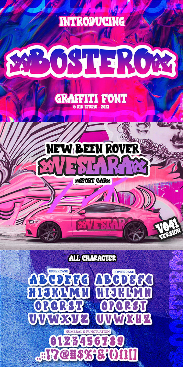 Bostero is a graffiti font style that embodies the urban tagging scene. This stylish font features thick, angular letters, and offers uppercase letters only. With its strong outlines and fat strokes, this is the font you need when you want to create a classic bubble graffiti font look. This font can use for a host of different content needs and projects. Create gorgeous printed quotes, standout packaging, and beautiful t-shirts! You can even use it to create amazing headings, logos, menus, and social media graphics.