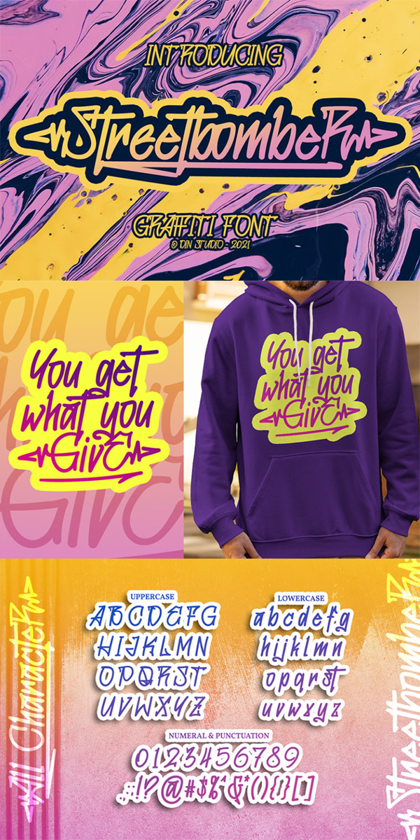 It is an urban font that echoes the classic tag lettering style. Use this cool and artistic graffiti font to breathe a street life vibe into your projects. This font is perfect for logos, printed quotes, cards, packaging, website or social media branding, and many more!