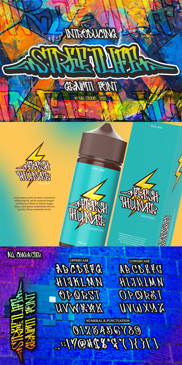 Make your graffiti text dance with this wonderful, rhythmic font that captures motion and is bound to call attention wherever you use it. This font is perfect for logos, printed quotes, cards, packaging, website or social media branding, and many more!