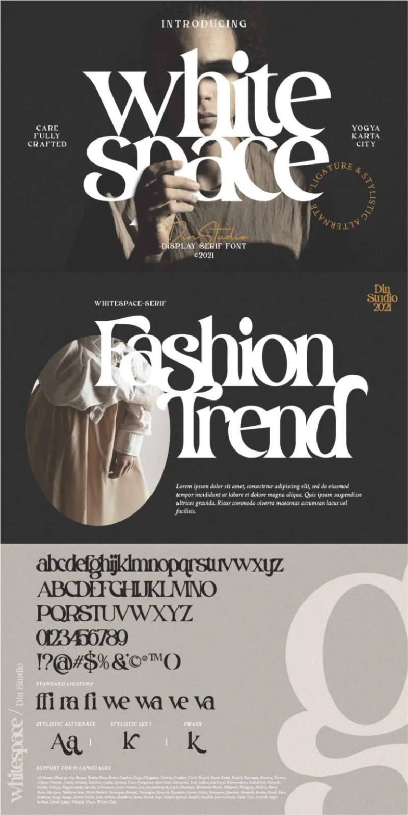 White Space – A Serif Font. This gorgeous, stylish and modern font can be used for a host of different content needs and projects. White Space is ideal for social media banners; posts, ads, printed quotes, t-shirt designs, packaging, and even a modern text overlaying any background images.