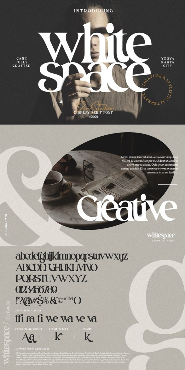 This gorgeous, stylish and modern font can be used for a host of different content needs and projects. White Space is ideal for social media banners; posts, ads, printed quotes, t-shirt designs, packaging, and even a modern text overlaying any background images.