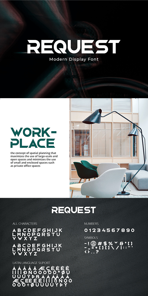 Request is a bold and authentic display font. It celebrates abstract shapes in all their eclectic beauty. This font will look truly outstanding in a wide range of contexts. See the previews above to get some inspiration on how you can use them. Happy Designing!