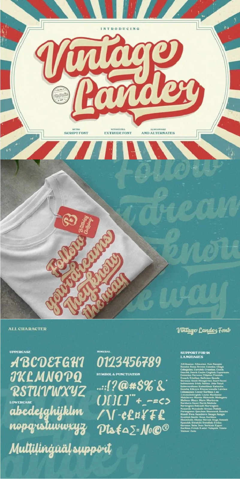 Vintage Lander – A Retro Script Font. This vintage font features thick and angular letters. With its strong outlines and fat strokes, this is the font you need when you want to create a classic bubble font look. This font becomes more special with the extruding version option. Vintage Lander can use for a host of different content needs and projects. Create gorgeous printed quotes, standout packaging, and