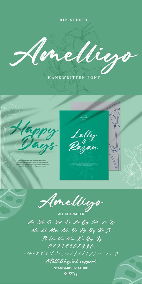 Amelliyo is a classy handwritten font. Made for any professional project branding. It is the best for logos, branding and of quotes. Every letter has a unique and beautiful touch. See the previews above to get some inspiration on how you can use them. Enjoy the font!
