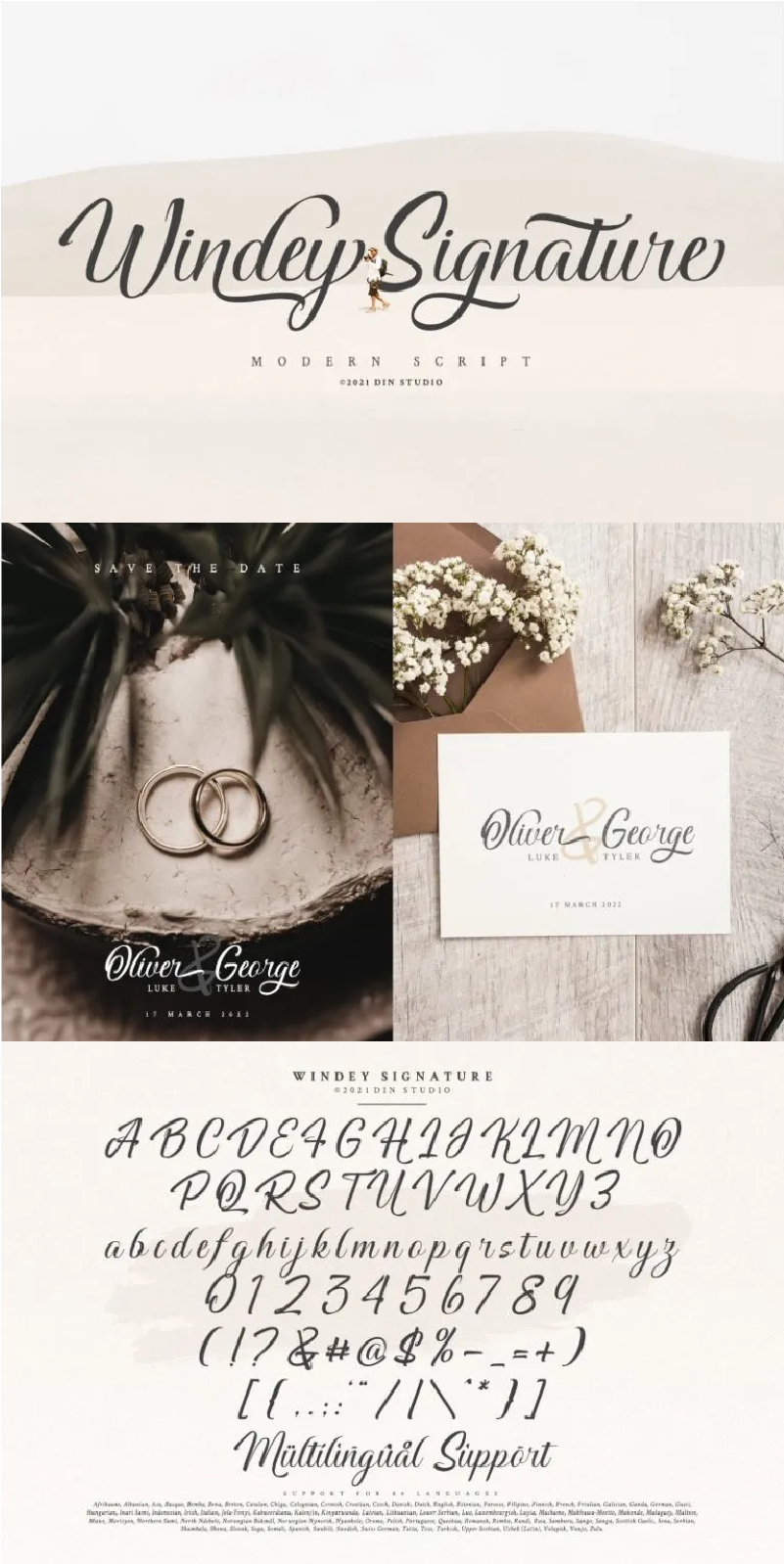 Windey Signature – A Modern Script Font. Giving you a simple, yet gorgeous solution to your branding. This font is another level script font. It encapsulates the essence of elegance and modernity. With its clean script-type design and curved indentations, this font will take your projects to the next level! Use it for headings, logos, business cards, printed quotes, invitations of all sorts, cards, packaging, and your website or social media branding.